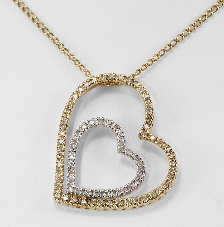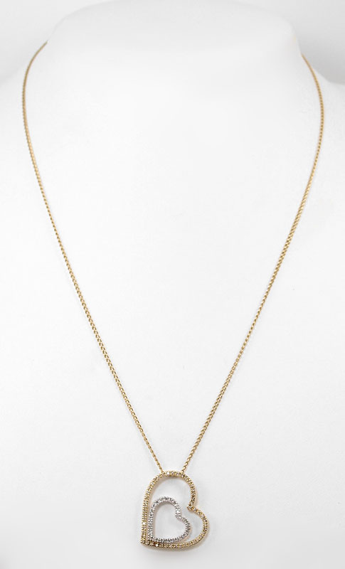 14K DIAMOND DOUBLE HEART NECKLACE: 14K yellow and white gold heart pendant contains 77 round full cut diamonds totaling approx. .50 Ct. Rated I1 in clarity and I-J in color. The diamonds are prong set. 19'' chain. Weight: 5.0 grams