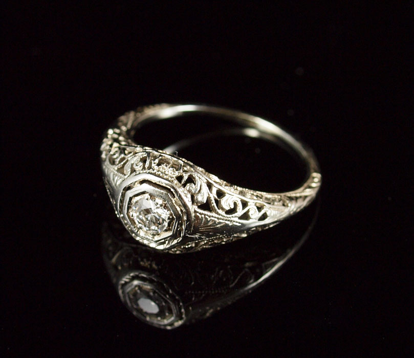 18K FILIGREE DIAMOND RING: 18K white gold filigree ring contains one round full cut diamond. Weight: .15 Ct. Approx. Rated VS in clarity and H-I in color. The diamond is prong set. Weight: 2.1 grams Size: 6.5