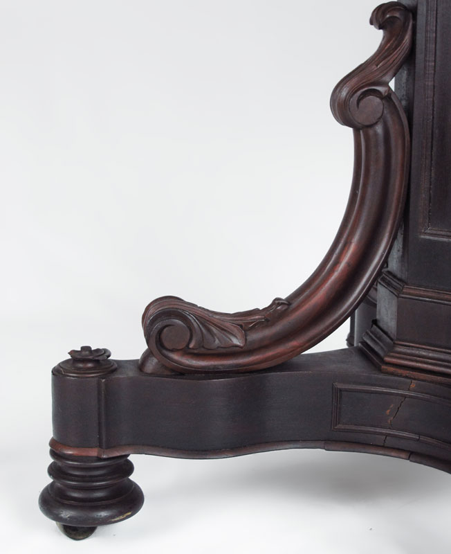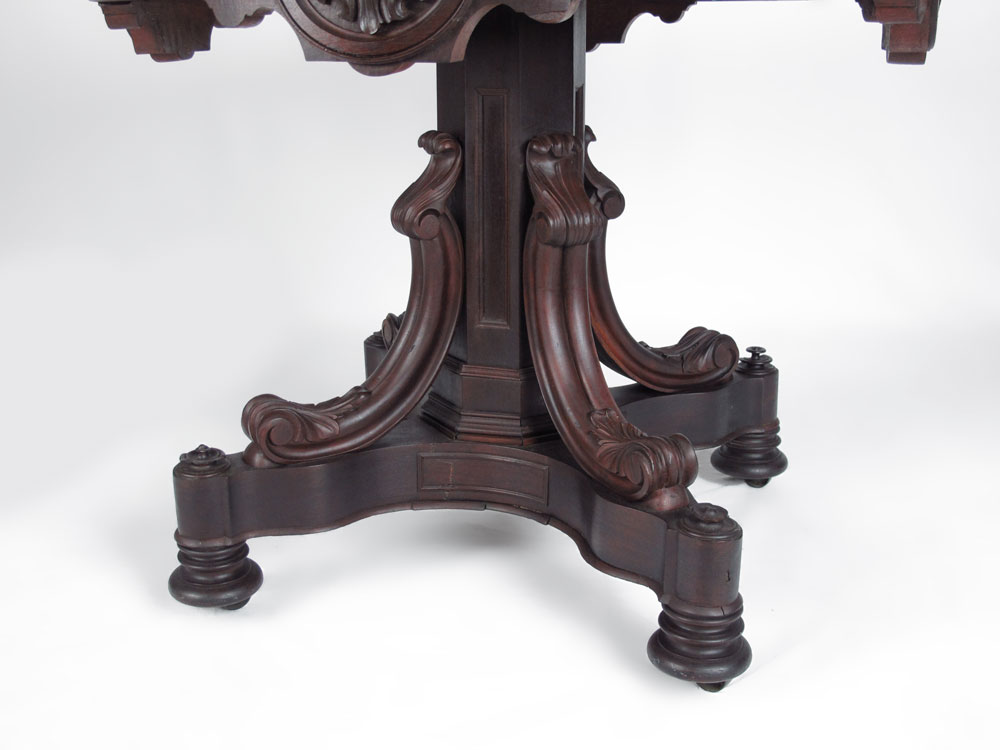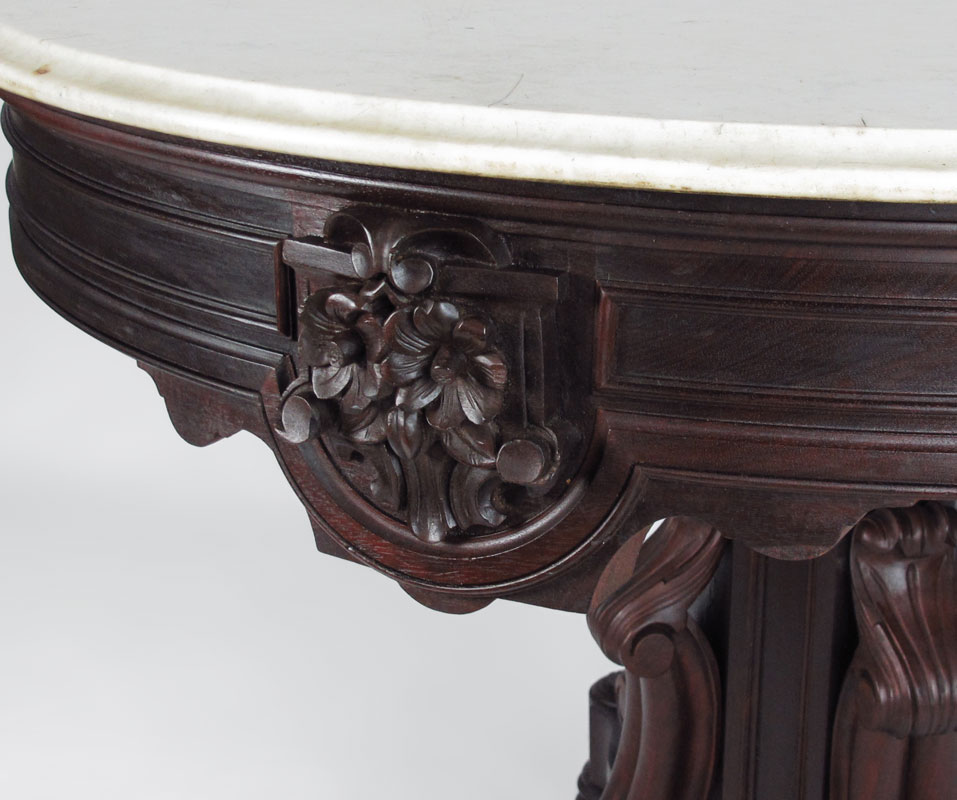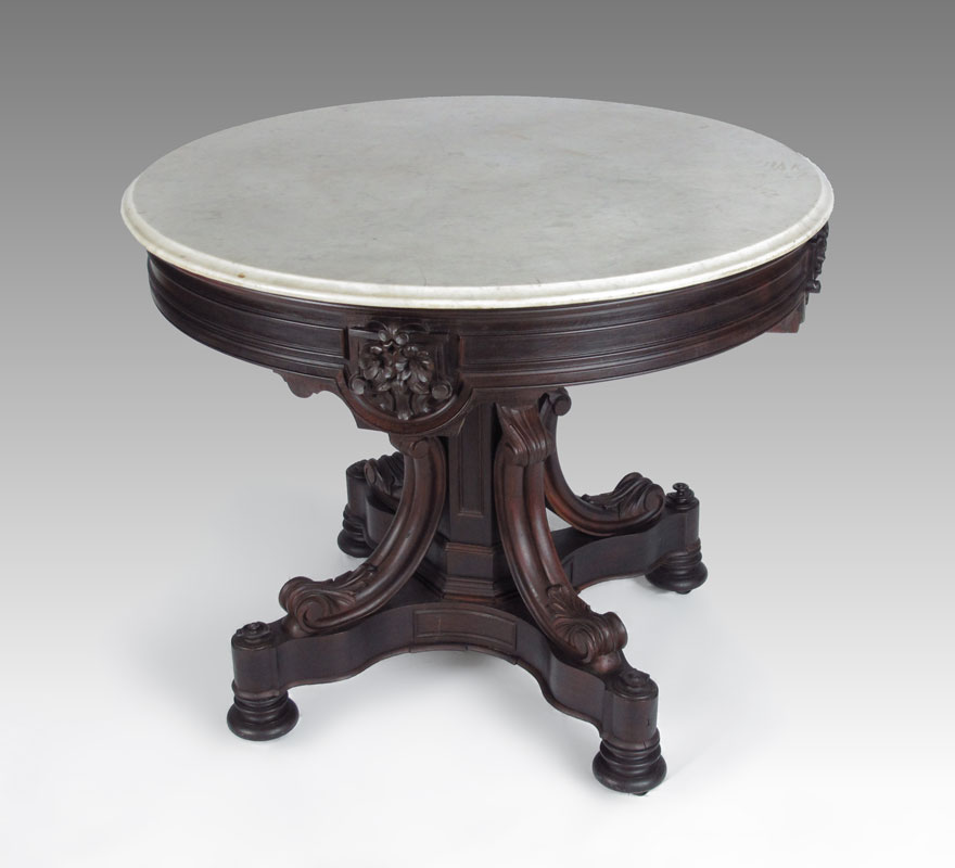 FINE VICTORIAN ROSEWOOD MARBLE TOP PARLOR TABLE: Rosewood with white marble top over carved skirt with applied shield and flowers decoration. Pedestal base with carved legs and decoration on castors. 31'' h. x 37'' dia.