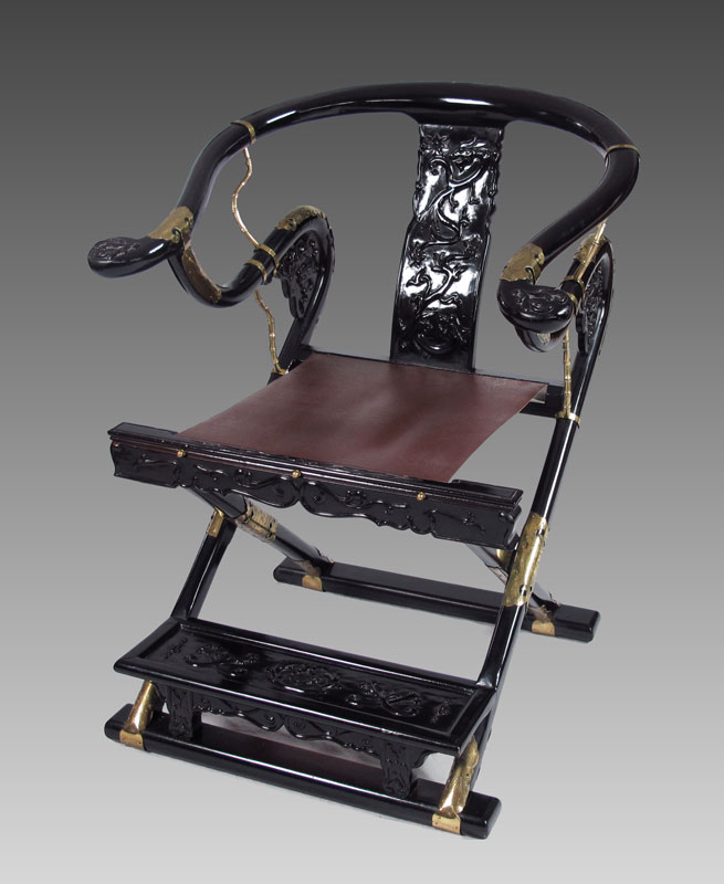 BRASS MOUNTED CHINESE BLACK LACQUER FOLDING CHAIR: U shaped top rails, foot rest, fabric seat. Approx. 34'' x 25 1/2'' x 24''.