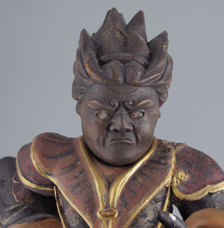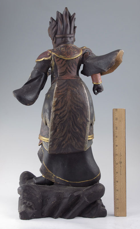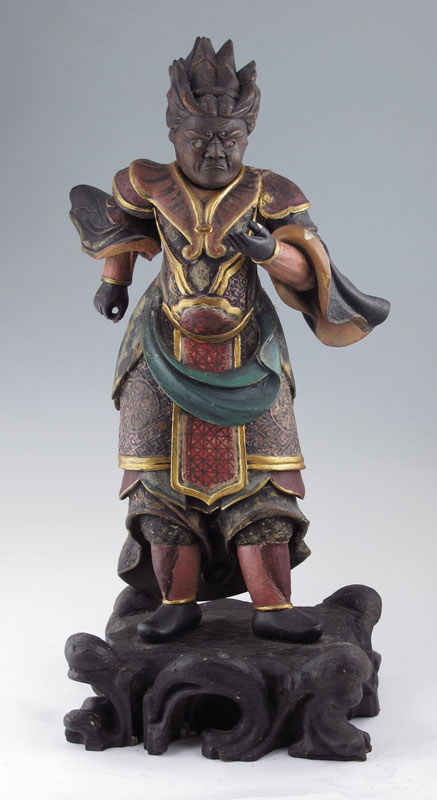 LARGE POLYCHROME CARVED WOODEN CHINESE WARRIOR: Parcel gilt, stands approx 24'' h. x 12'' w.