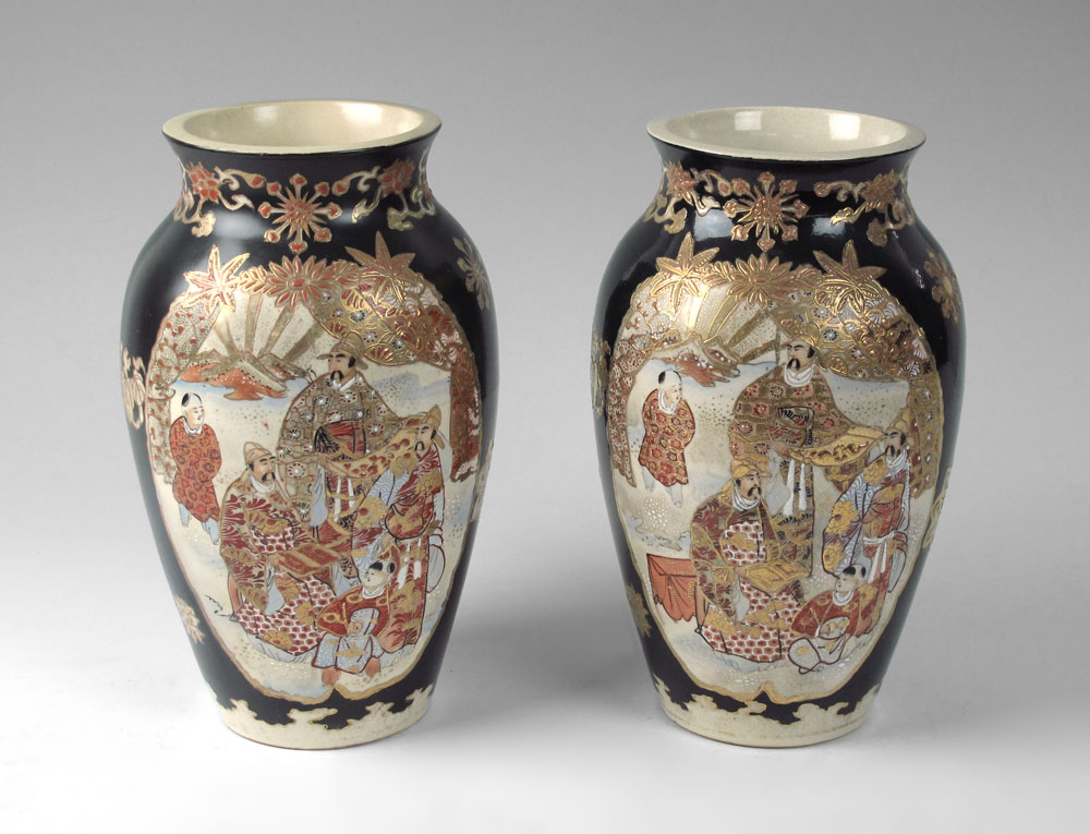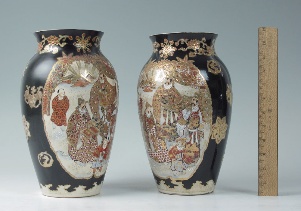 PAIR JAPANESE SATSUMA VASES: Black ground with figures in reserve. Earthenware, 11'' h.
