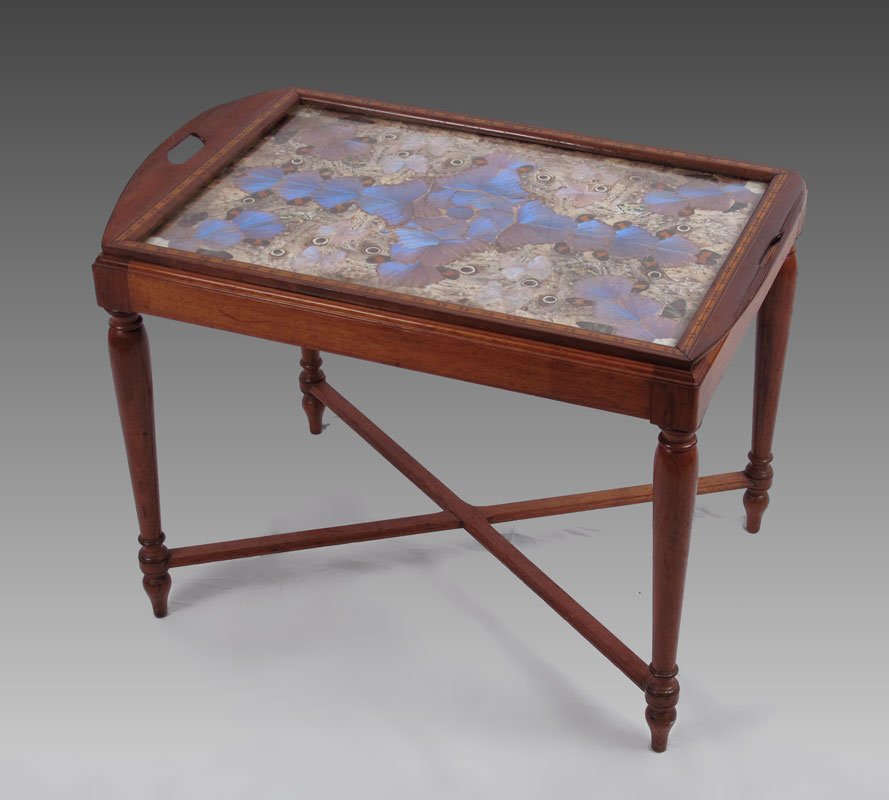BRAZILIAN BUTTERFLY TEA TABLE: Removable tray with butterfly wing designs, inlaid border. Measures 21 3/4'' h. x 28 3/4'' x 19 3/4''.