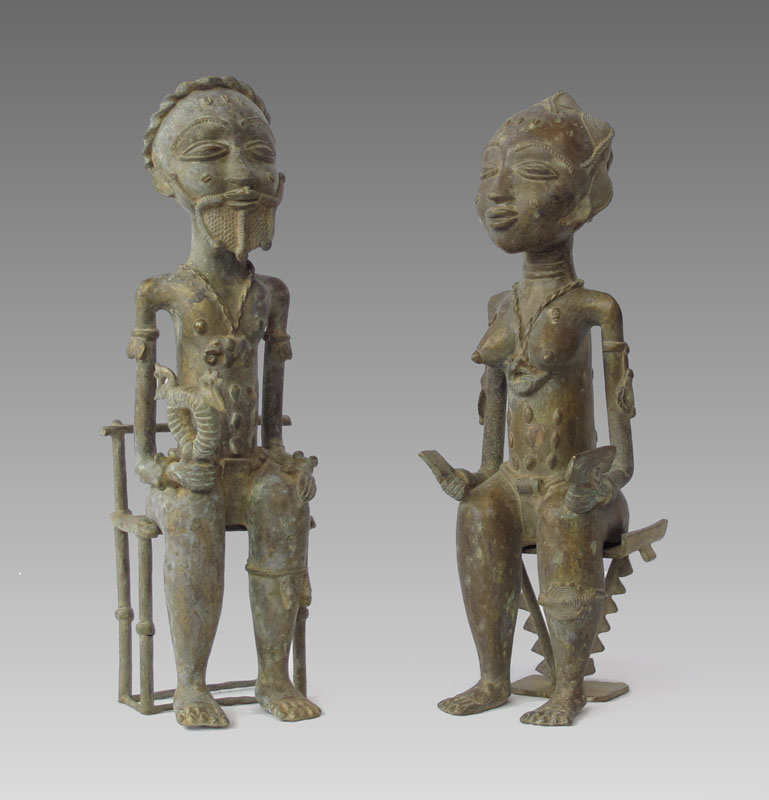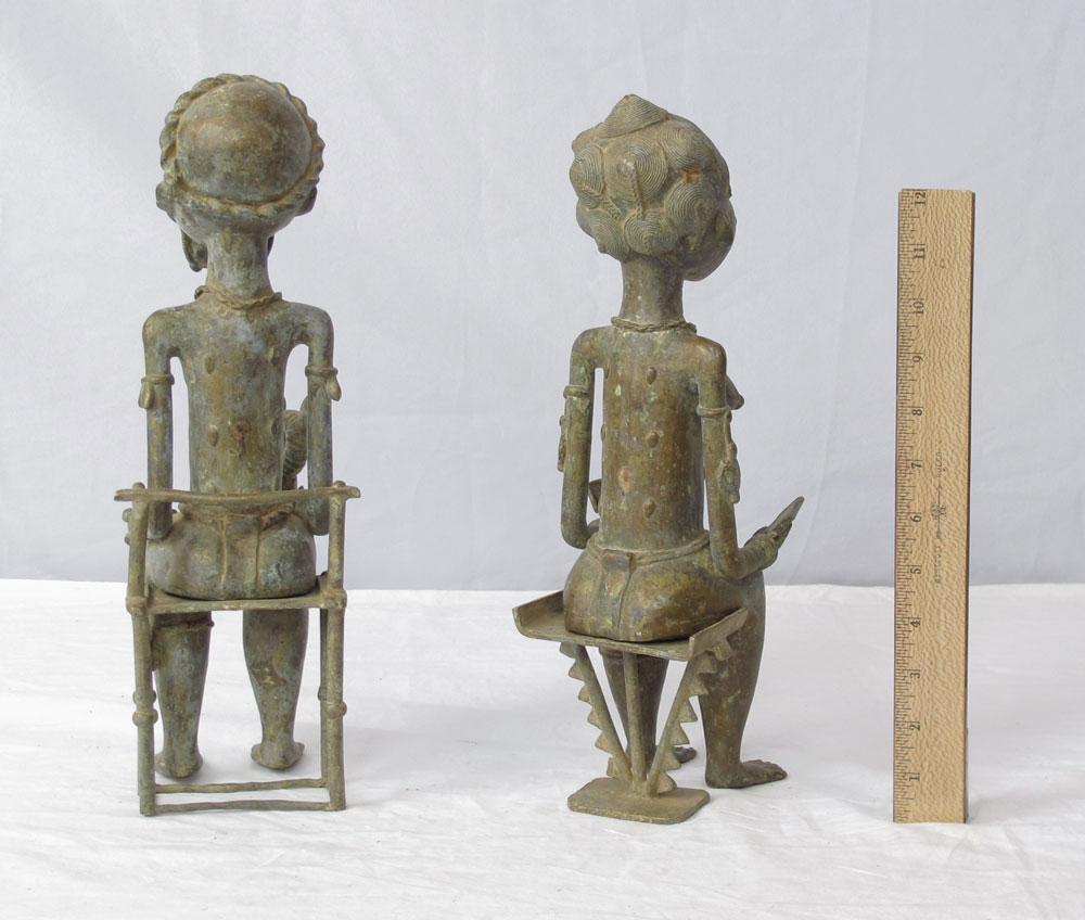 PAIR OF AFRICAN BRONZE IVORY COAST BAULE TRIBAL FIGURES: Seated in chairs. Approx. 14'' x 5'' x 5''