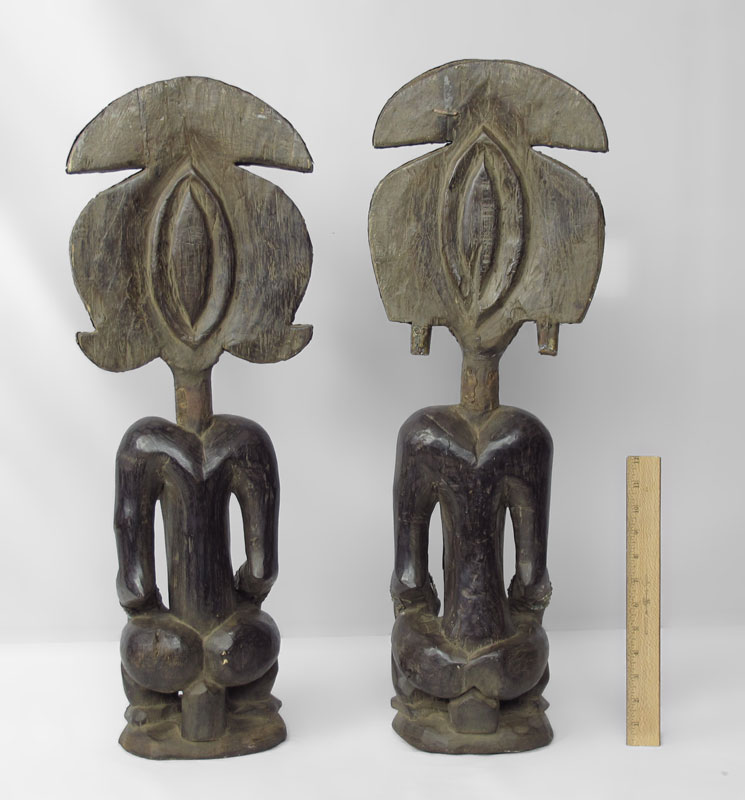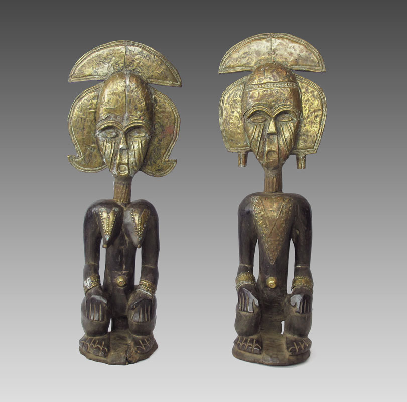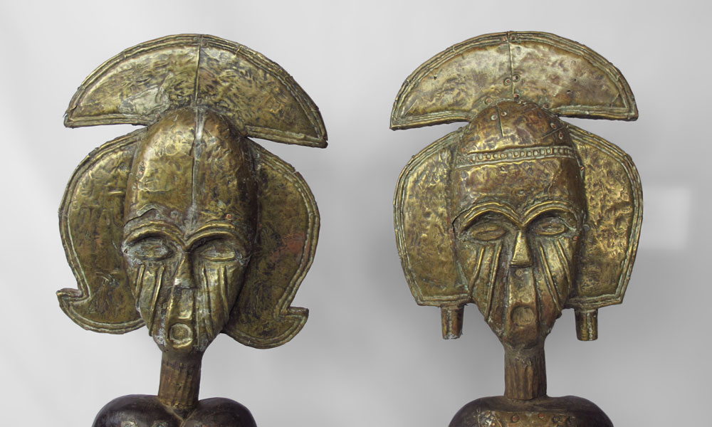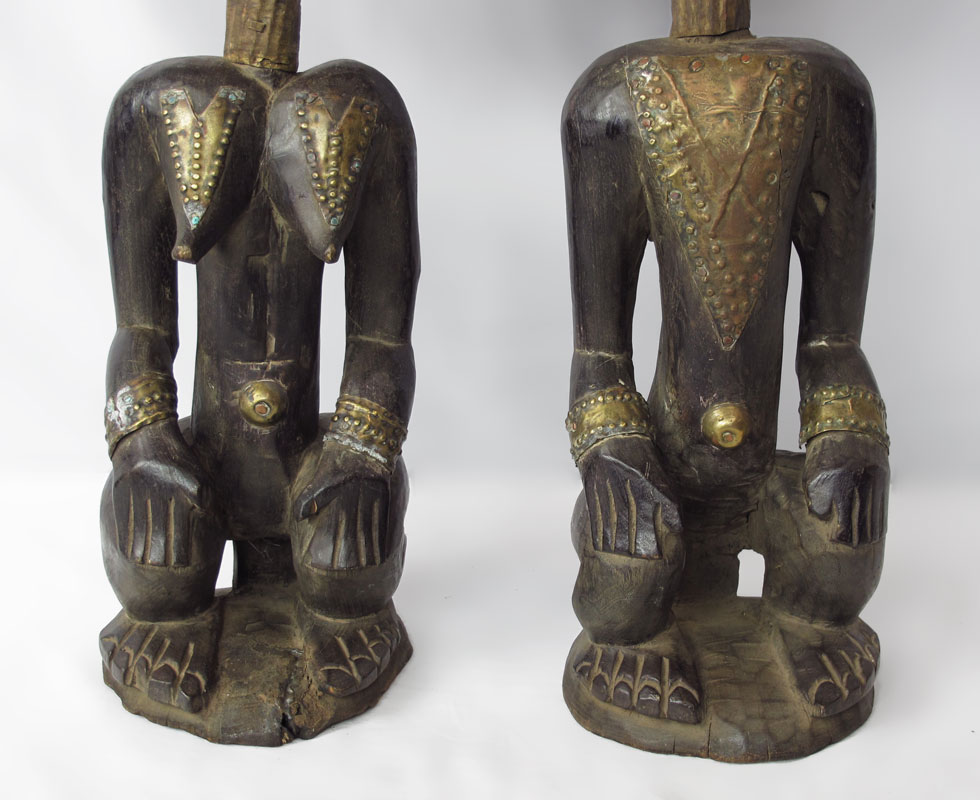 AFRICAN BAKOTA RELIQUARY FIGURES, GABON: Seated couple, metal applied to wood, approx. 28'' x 9 1/2'' x 7''
