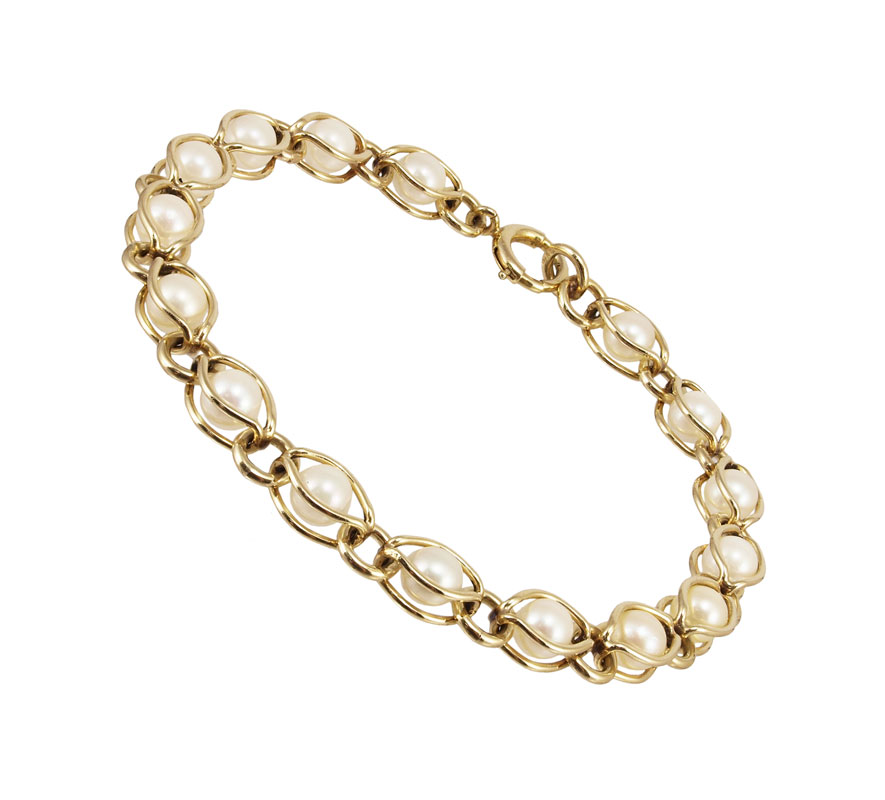 GOLD AND PEARL BRACELET: 14K yellow gold encasing 16 cultured pearls, 4.50 mm, cream in color with low/medium luster. Spring ring clasp. Length: 7'' Weight: 9.9 grams.