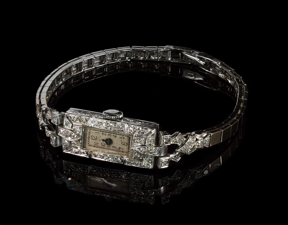 ART DECO 14K GOLD DIAMOND DRESS WATCH: 14K white gold watch framed in diamonds with attached gold bracelet. 15 jewel Swiss movement. Arabic numerals, missing minute hand. Length: 6 1/2''. Weight: 16 grams.