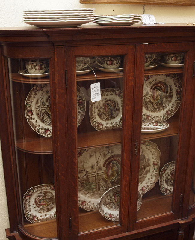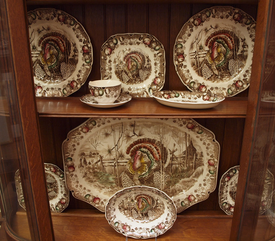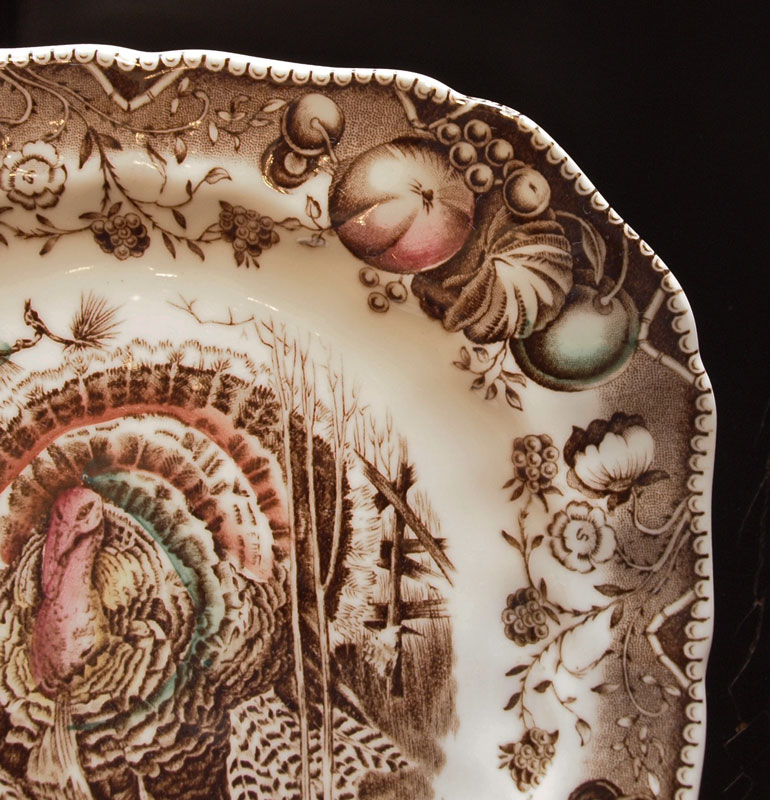 JOHNSON BROS ''HIS MAJESTY'' TURKEY CHINA: 35 pieces to include the 20'' turkey platter, 8 dinner plates, 8 square salad plates. 8 cups (2 chips), 8 saucers, an open vegetable bowl and a relish dish.
