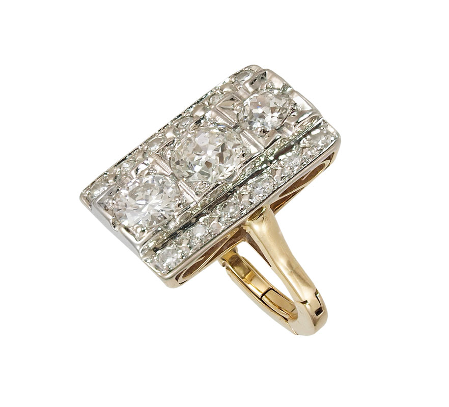 CUSTOM 2.00 CTW DIAMOND RING: Designed to spotlight three generations. 14K yellow gold ring contains 3 old European round and round brilliant cut diamonds and 12 round single cut diamonds, all totaling approx. 2.00 Ct. Rated VS in clarity and H-I in color. The diamonds set prong set in white gold. Expanda-shank. Weight: 5.8 grams. Size: 4