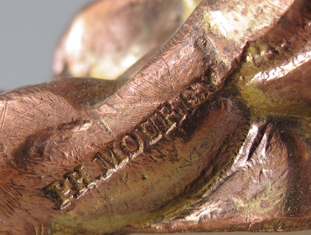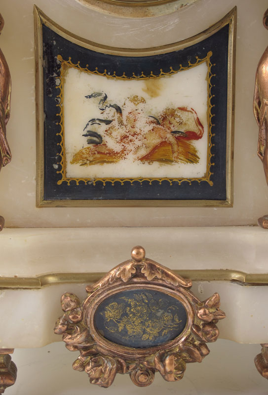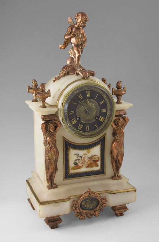JAPY FRERES FIGURAL CUPID ALABASTER MANTLE CLOCK: Alabaster case with bronzed cast metal cupid, urn finials, figural maiden columns and floral frame on 4 feet. Hand painted decoration under face and in frame. Mixed metal face with Roman numerals, beveled class crystal. Time and strike movement marked Japy Freres. no key or pendulum. Measures 16 1/4'' h. x 8 1/2'' x 5''.