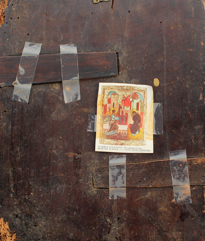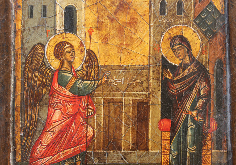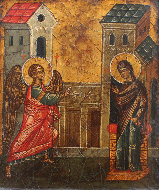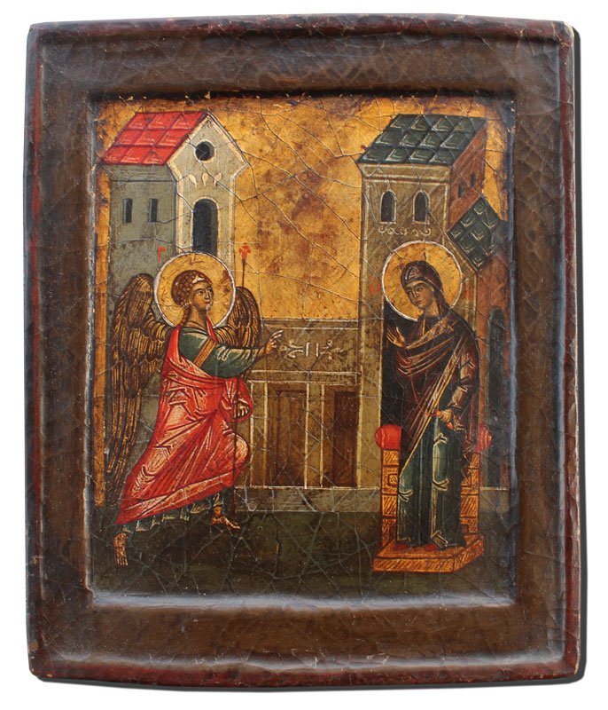EARLY RUSSIAN ICON DEPICTING ANGEL AND MARY: Oil/Cradled Wood Panel, overall size is 12'' x 9 3/4'', probably 19th century or earlier.