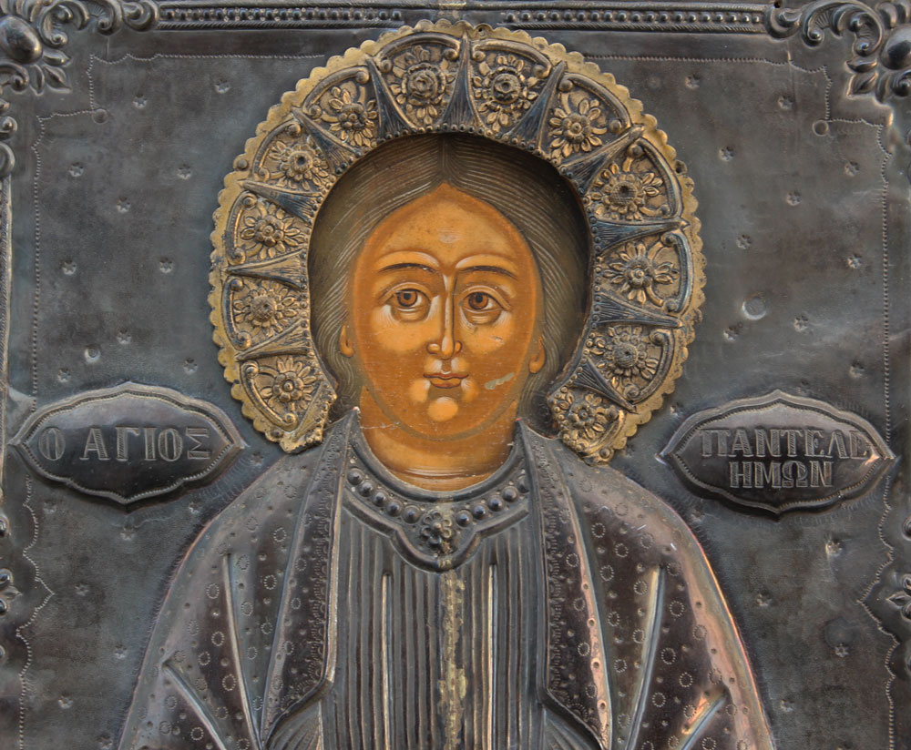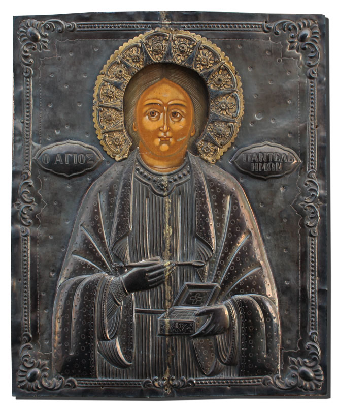 GREEK ICON OF ST. PANTELEIMON: Male physician - who was martyred in the early 4th c., Oil/Board with Silvered Metal Okblad, overall measurements 15'' x 12'', Greek inscriptions stamped into the metal.