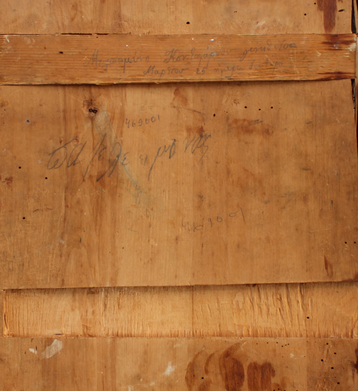 CONDITION: The okblad has been repaired with a mend in the center and the wood is a cradled panel with partial cracking on the left side.