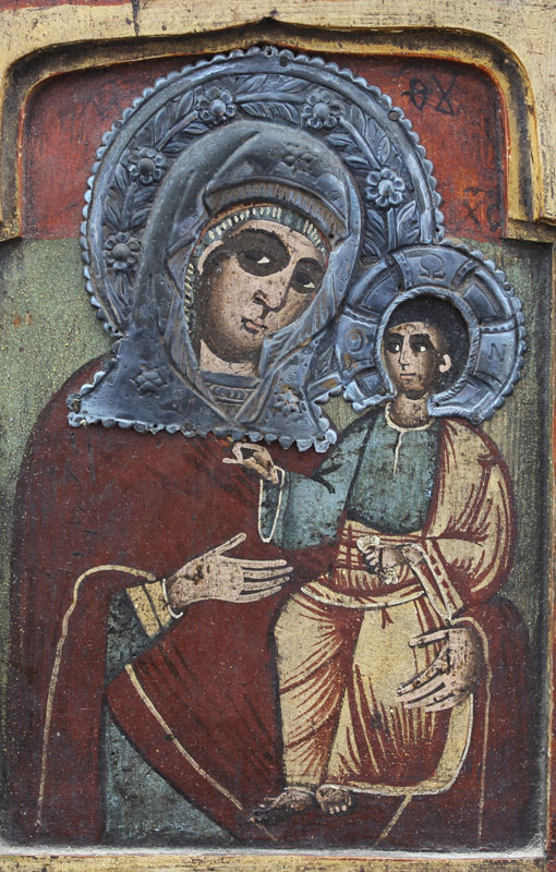 TRI-PANEL ICON WITH MADONNA AND CHILD: Triptych depicting on the top portion of the side panels (left to right) the female martyrs Petka and Nedelya (or their Greek names: Paraskeve and Kyriake), and on the lower portions George and Demetrius. 11 1/4'' X 14 1/4'' overall, side panels are hinged with metal pins, age unknown.