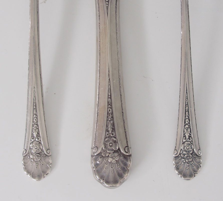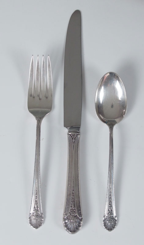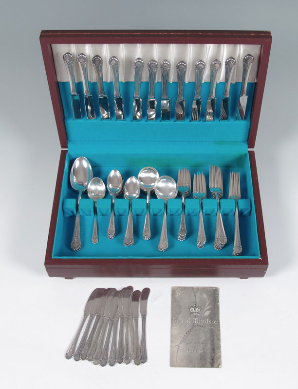 TOWLE ROYAL WINDSOR STERLING FLATWARE SERVICE: Approx. 75 pieces in the Royal Windsor pattern by Towle to include 12 forks (7 1/4''), 11 salad forks (6 1/2''), 12 teaspoons (6''), 12 soup spoons (6 1/4''), 12 hollow knives (8 5/8''), 12 solid butter knives (5 7/8''), 3 tablespoons (8 3/8''), sugar scoop (5 3/4''). Approx. 78.8 troy oz.