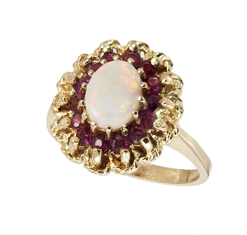 DIAMOND AND RUBY RING: 14K yellow gold ring centers one oval cabochon cut opal, approx. 1.00 Ct. with a Blue/Green and Red/Orange play-of-color. Brightness level: 1. Framed by 14 round mixed cut synthetic rubies, approx. .75 Ctw. The opal and rubies are prong set. Weight: 5.4 grams. Size: 6.5