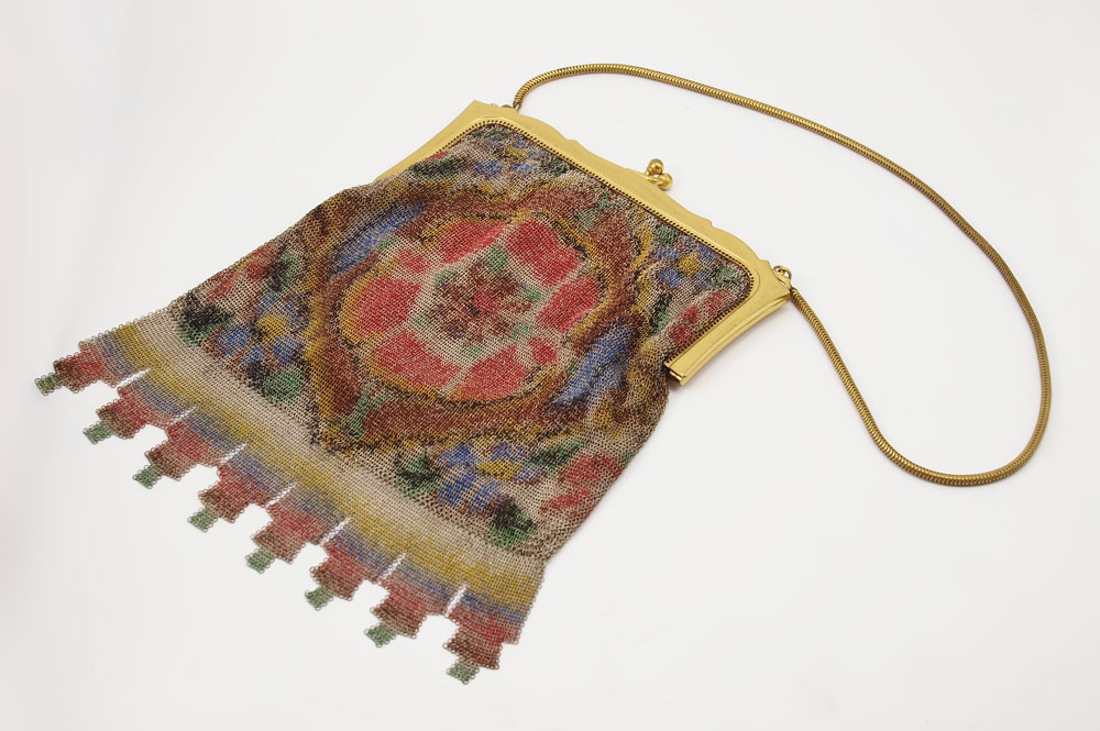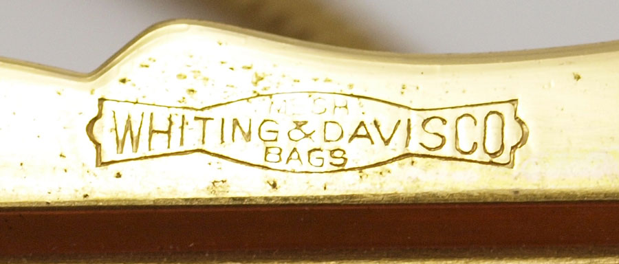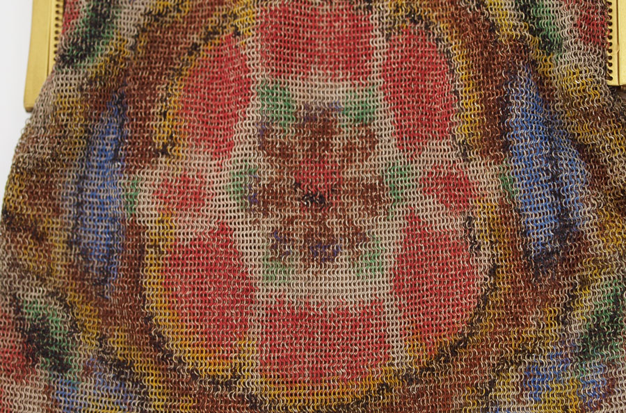 VIINTAGE WHITING AND DAVIS MESH PURSE: Vivid colors, fringe type shape along the bottom, satin lined interior with pocket and small mirror. 7'' x 5'', excluding the chain.