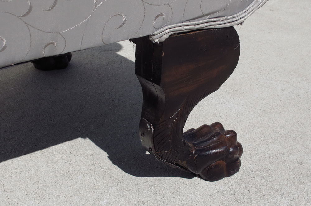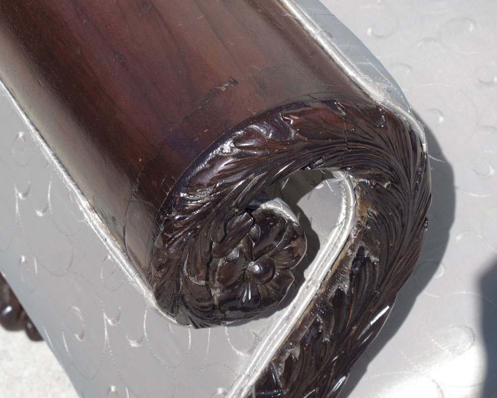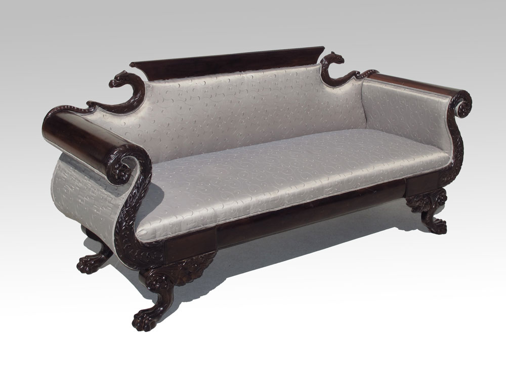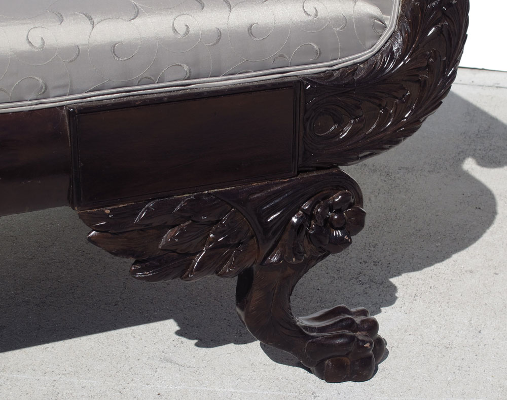 CARVED GRIFFON AMERICAN EMPIRE SOFA: Carved back rail with carved figural griffon heads, scroll arm rests with floral motif carved front on 4 paw feet. Green upholstery. 38 3/4'' h. x 85'' x 29 1/2''.