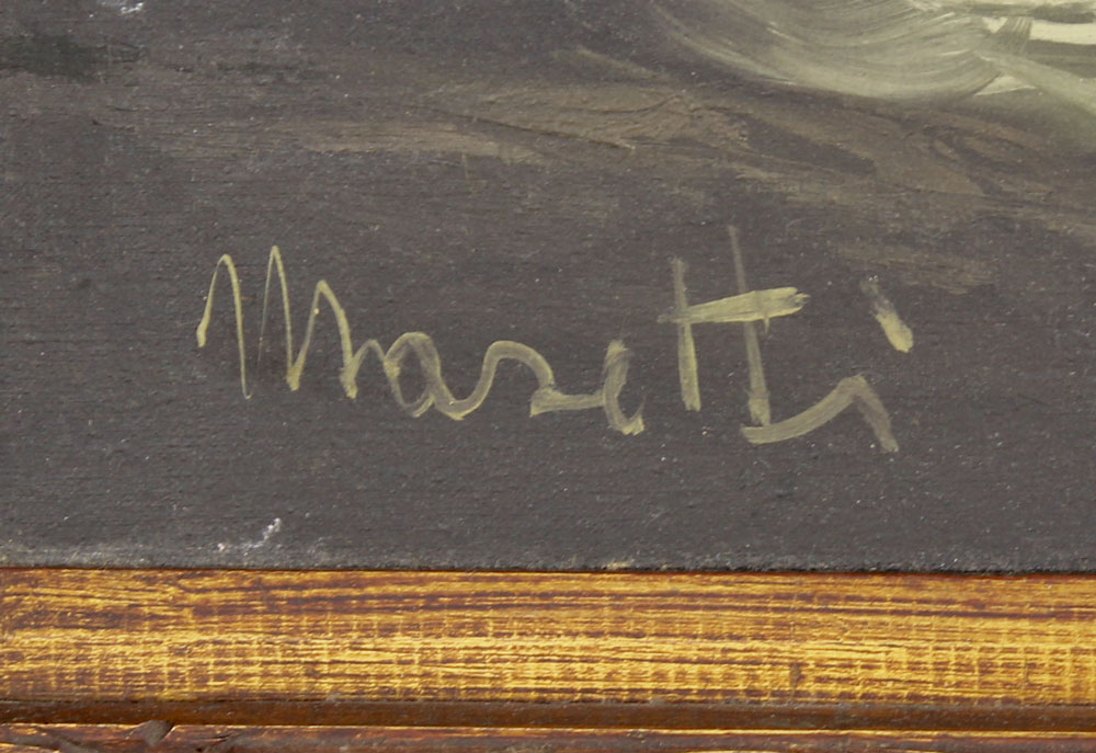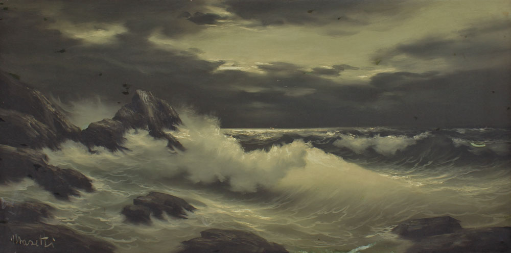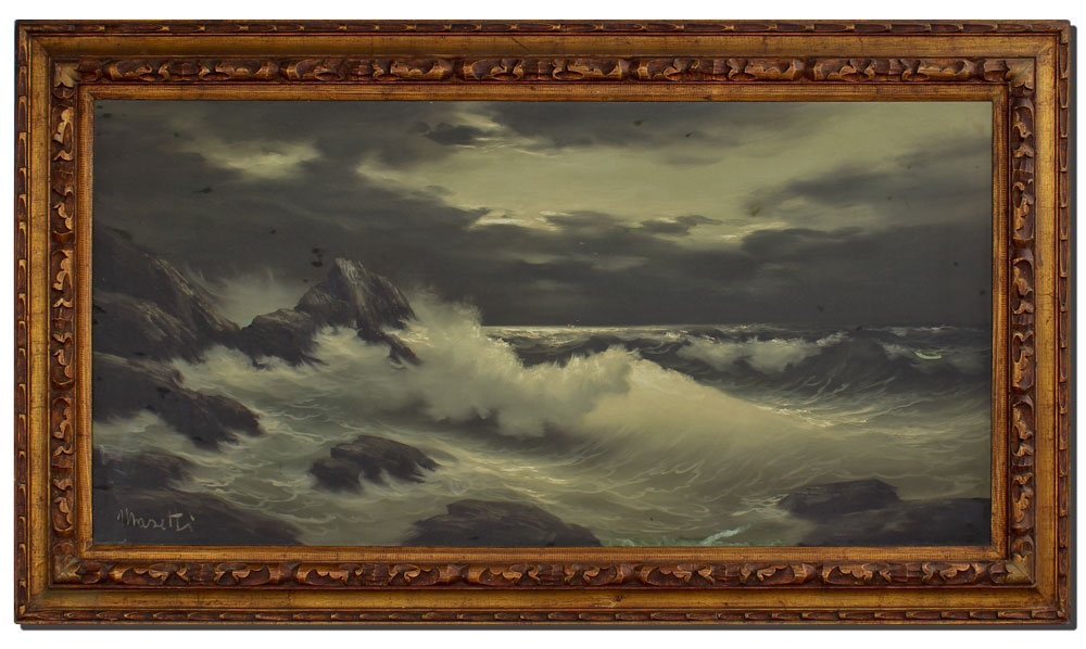 LARGE PAINTING OF SURF CRASHING SIGNED MORETTI?: Oil/Canvas, 24'' x 48'', signed lower left, encased in carved wood frame, 32'' x 56''.
