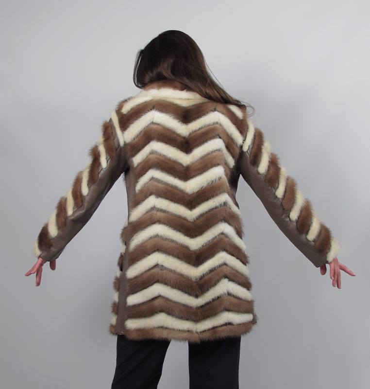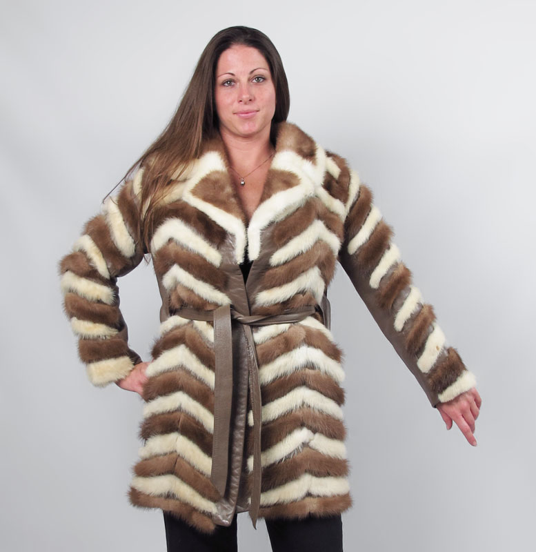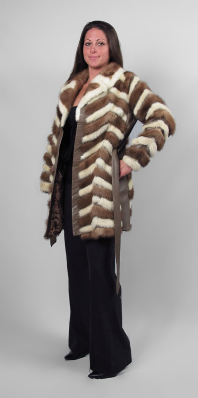 BROWN AND CREAM STRIPED MINK CAR LENGTH COAT: Leather alternating with mink, tie leather belt. Approx. 34''L., 18'' shoulder to shoulder.