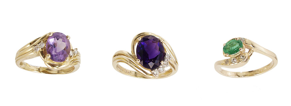 THREE 14K GEMSTONE RINGS: 14K rings with amethyst, emerald and approx. .15 CTW diamonds. Weight: 10.7 grams.