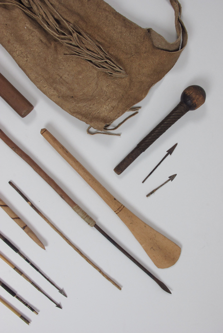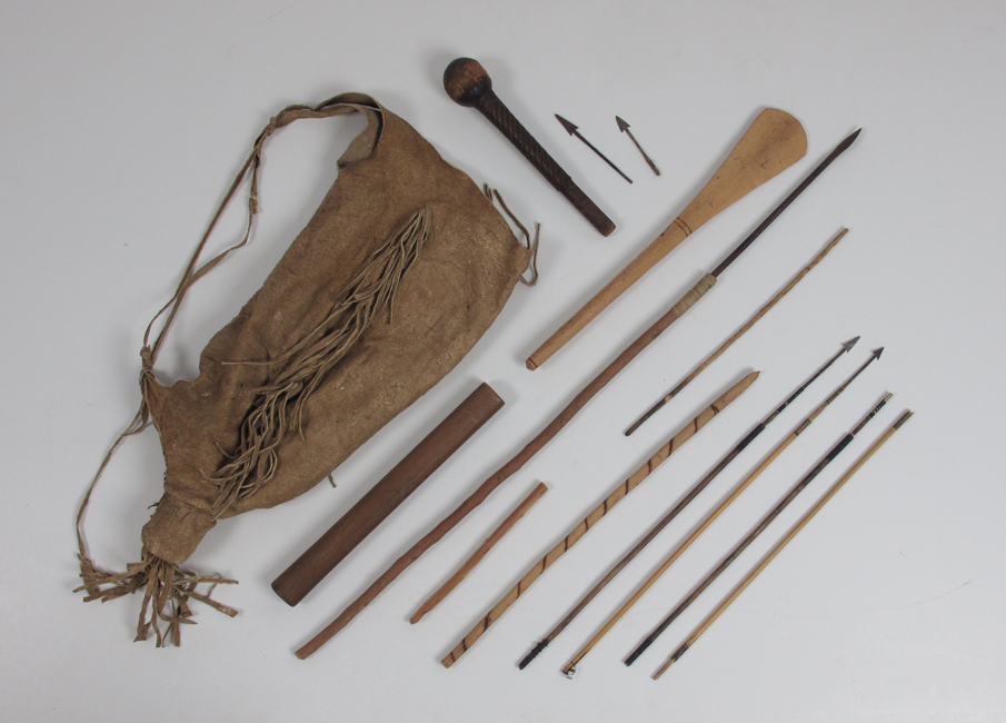 AFRICAN PYGMY SPEAR & ARROW SET: Spear and 2 arrows with metal tips, 3 additional shafts and one additional tip. Sold with several other tribal items and hide bag. Spear measures 39 1/4'' l.. Age and origin unknown, possibly Efe tribe.