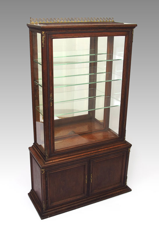 DIMINUTIVE OAK DISPLAY CABINET: Brass gallery, single glass door, mirror back interior with glass shelves. 55 1/2'' h. x 28'' x 12''.