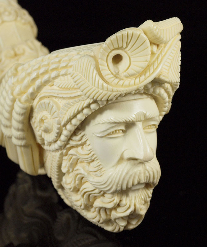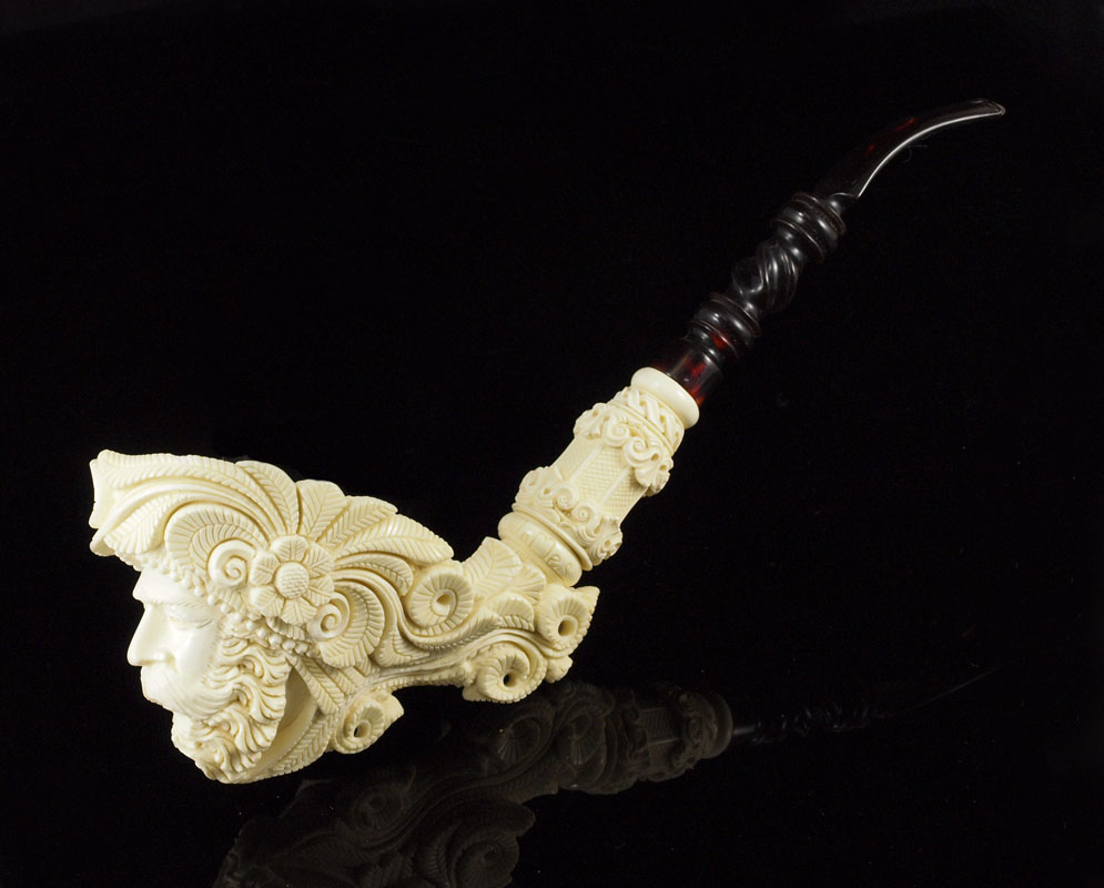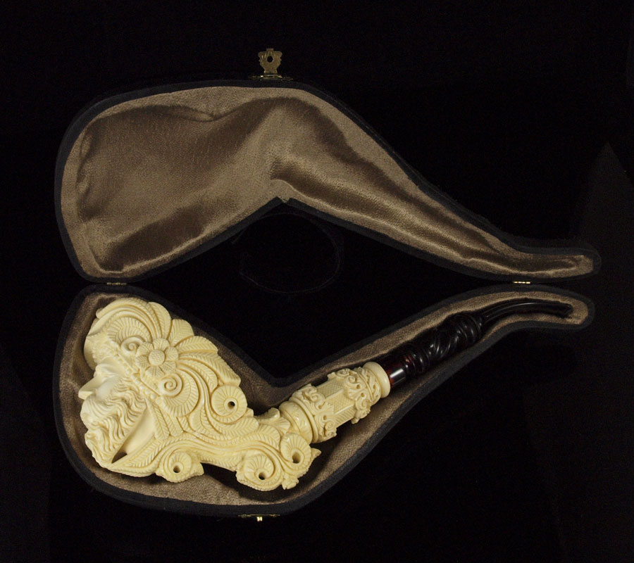 CARVED MEERSCHAUM PIPE WITH CASE: Carved Sultan head bowl with carved amber stem, 10 1/2'' long. Sold with original case.