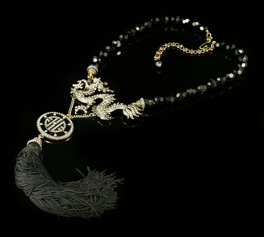 HEIDI DAUS SHIMMERING DRAGON TASSEL NECKLACE: Simulated Jet beads support the sparkling full figure dragon over central medallion and black tassel. 24''l. plus 10'' dangle, adjustable wear length.