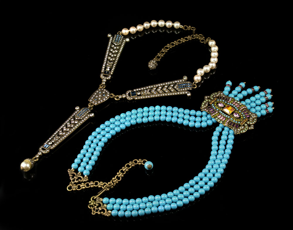 2 HEIDI DAUS NECKLACES: 1)Three row faux turquoise beads with ''Femme Fetale'' station sparkling with amethyst, citrine, turquoise and peridot colored rhinestones. 18''l. 2)Art Nouveau style panel pendant necklace, 16'' plus 5'' dangle, please note wear to faux pearls. Sold as a lot.