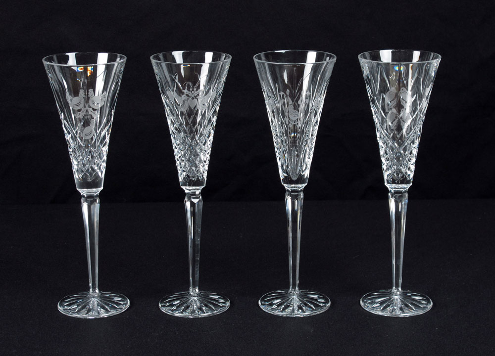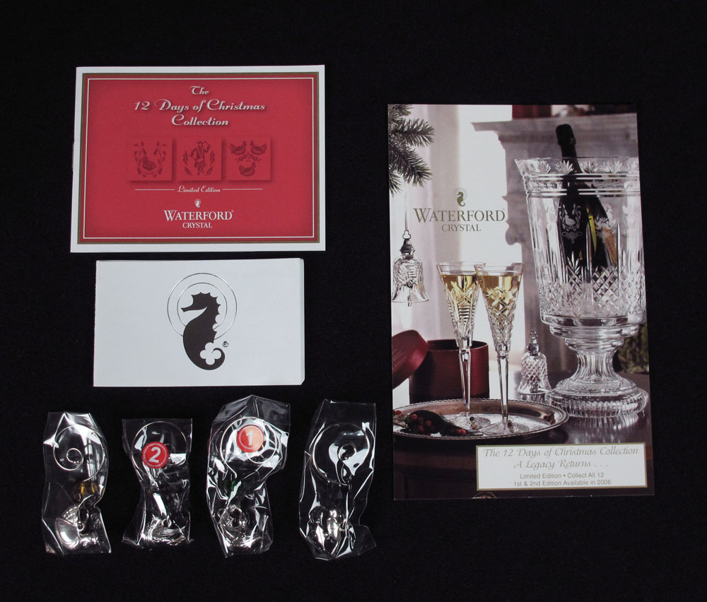 4 WATERFORD 12 DAYS OF CHRISTMAS CRYSTAL STEMS: In the presentation boxes, each stem 10 1/4'' h. Box measures 5 7/8'' h. x 12 1/2'' x 6''.