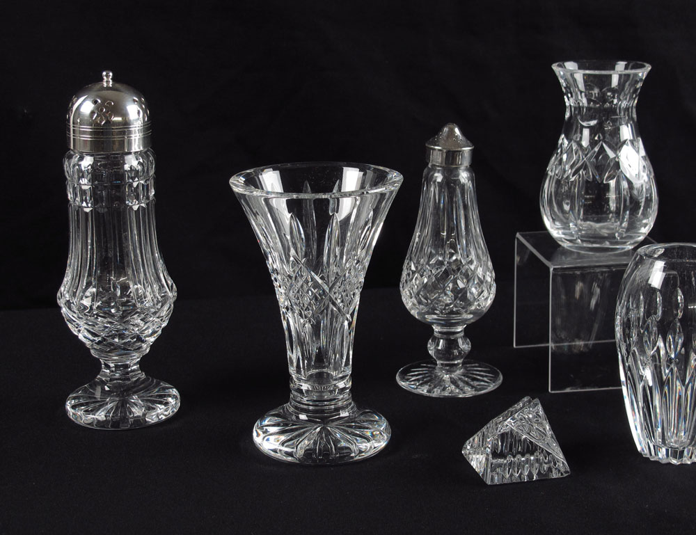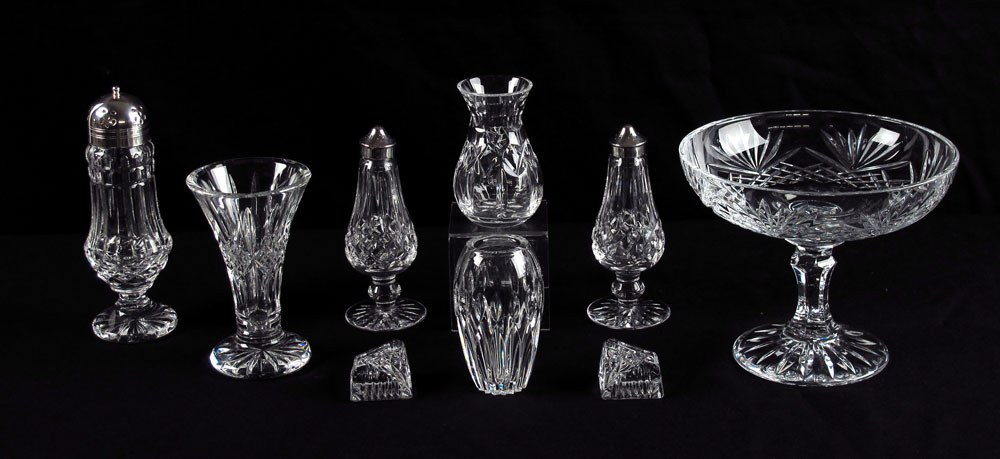 WATERFORD CRYSTAL COLLECTION: To include 2 shakers, 3 vases, compote and 2 place holders. Compote measures 6 1/4'' h. x 8'' dia.