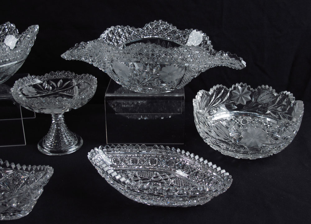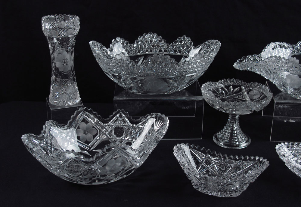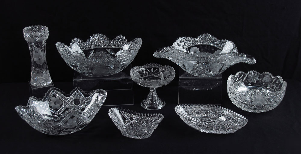 8 PIECE ASSEMBLED COLLECTION OF CUT GLASS: Collection of center bowls, tray, compote and vase. Largest center bowl measures 4 1/2'' h. x 14'' x 8 1/4''.