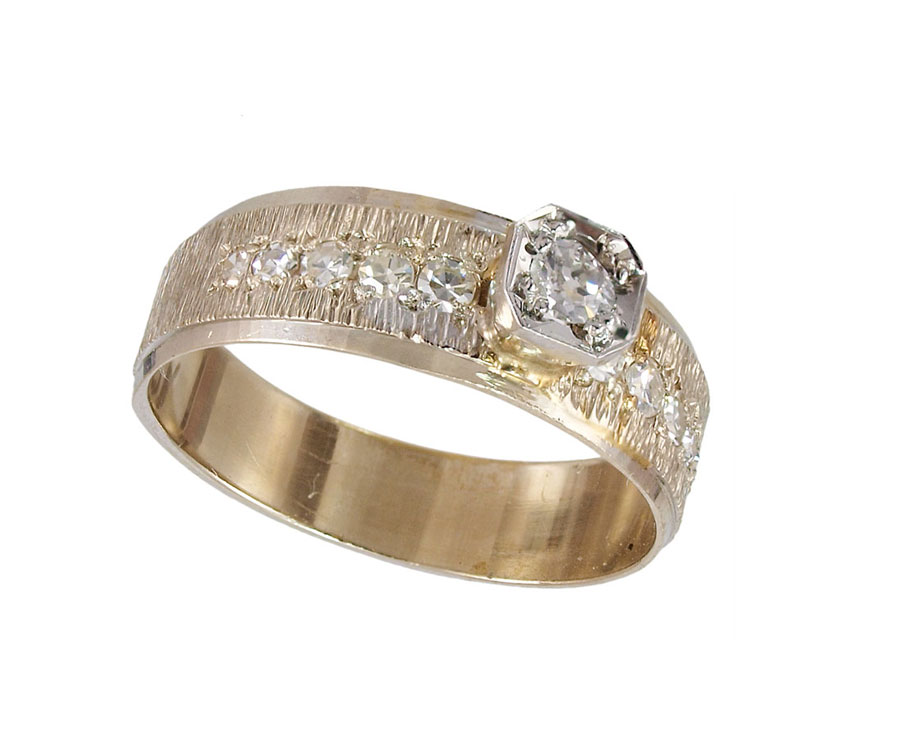 14K .25 CTW DIAMOND RING / WEDDING BAND: 14K yellow gold ring contains one old European round cut diamond and ten round single cut diamonds. Weight: .25 Ct. Approx. The diamond average VS in clarity and H-I in color. The diamonds are prong and deep set. Weight: 3.0 grams. Size: 6.25