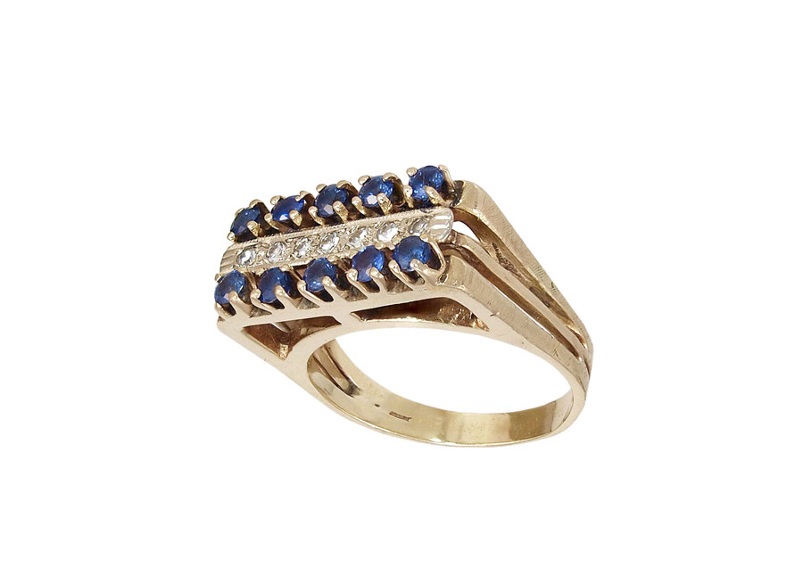 14K SAPPHIRE & DIAMOND RING: 14K yellow gold ring contains 7 round single cut diamonds. Weight: .10 Ct. Approx. VS in clarity and H-I in color. 10 round mixed cut sapphires. Weight: 1.00 Ct. Approx. The sapphires and diamonds are prong set. Weight: 7.2 grams. Size: 7.5