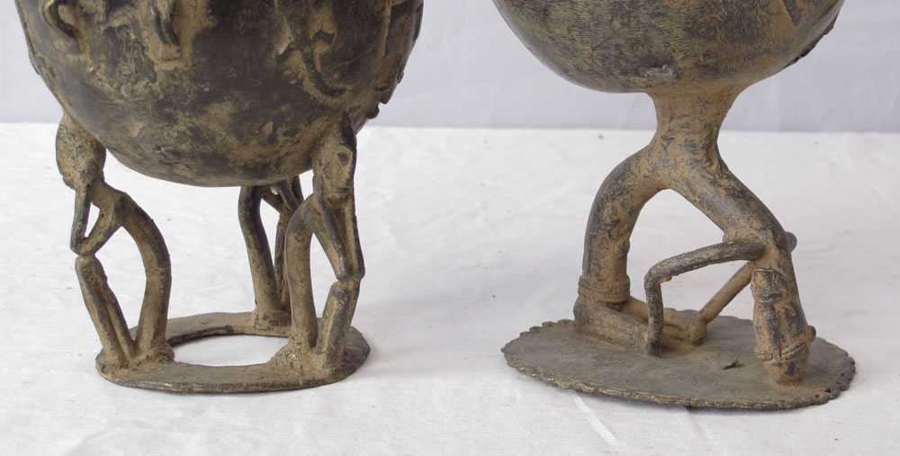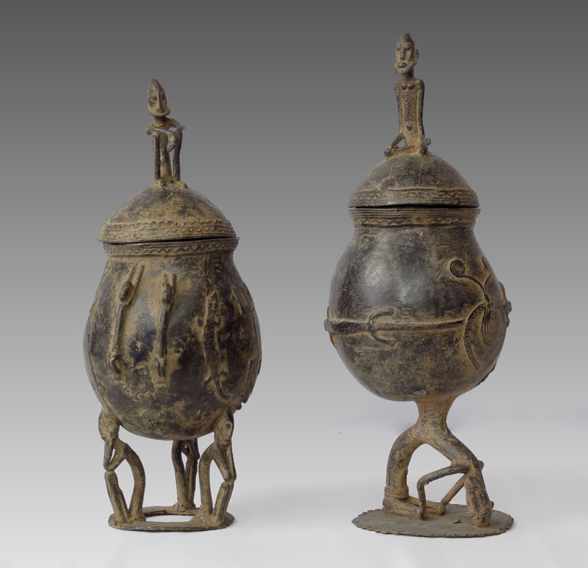 TWO AFRICAN BRONZE DOGON LIDDED VESSELS, MALI: Approx. 15'' x 6'' and 14'' x 5''