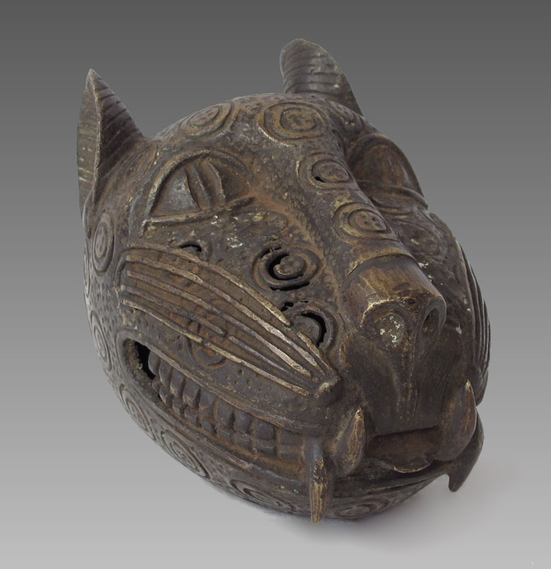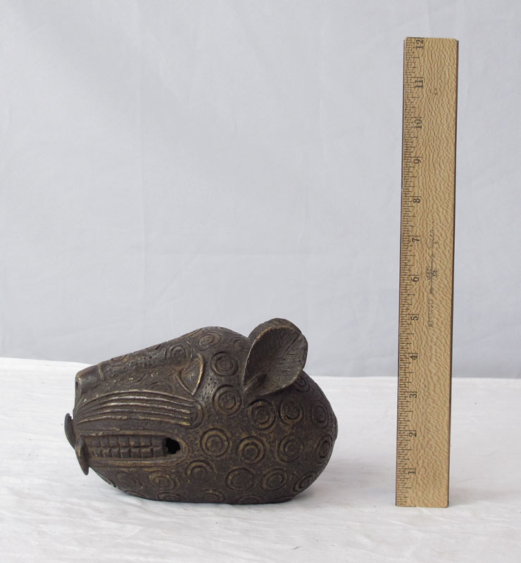 AFRICAN BRONZE BENIN LEOPARD HEAD: With stand, 4 1/2'' x 4 1/2'' x 7 1/2''