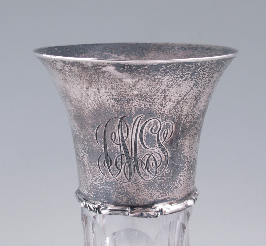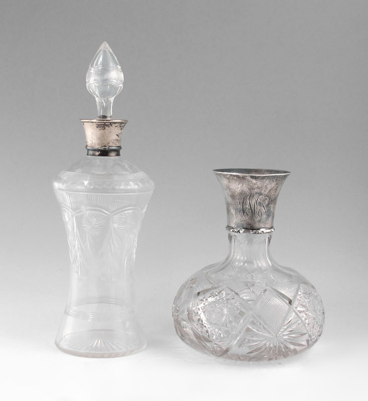 STERLING MOUNTED DECANTER: Unknown maker sterling collar marked Sterling 923 I. B., 925-100 Fine. Cut glass base. Measures 7 1/4'' h. x 5 3/4''. No stopper. Sold with cut glass carafe with silverplate collar and cut glass stopper, 1 3/8'' h. x 4 1/2''.