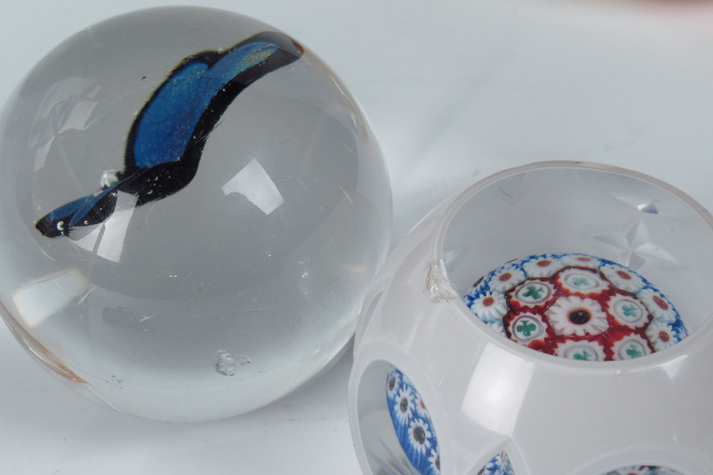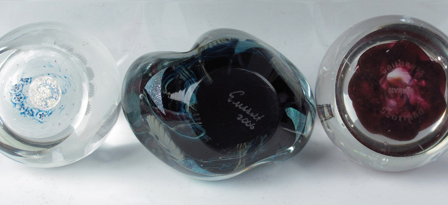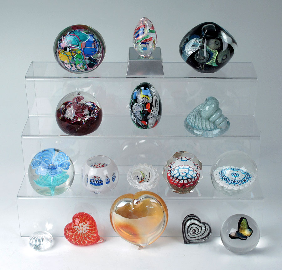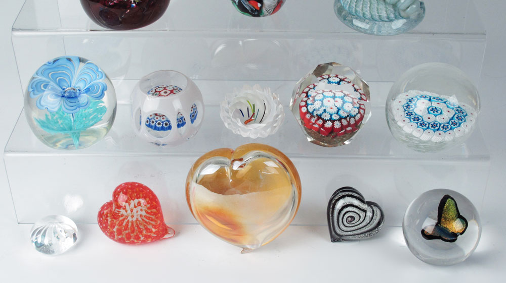 LARGE COLLECTION OF ART GLASS PAPERWEIGHTS: To include, Eickholt 2006 etched signature and date 3 3/4''h.; Murano glass with worn foil label to bottom 2 1/2''h.; unsigned faceted millefiore design 2 3/8''; Caithness Scotland Myriad 2 1/2''; Floating Butterfly flat bottom no signature 2 1/2'' ding to side; Cut and faceted white over clear over millefiore unsigned 1 7/8'' ding to upper edge; Glass Eye Studio 98 2 3/4'' acid signature and date; unsigned Seashell ish 2 1/2''; R Strong heart signed and dated 2002 1 1/2'' chip to very tip; and a 3 1/2'' dual position art glass weight signed Klizer? 96. Plus a few unsigned and a LED battery operated stand. Sold as a lot.