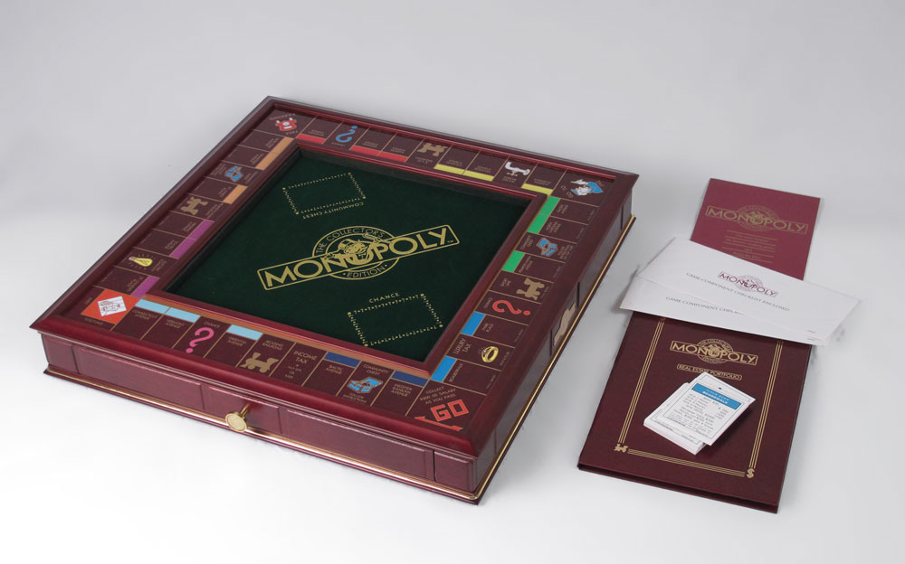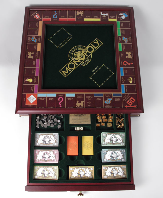 FRANKLIN MINT MONOPOLY GAME: Self storing, complete with replicas of the original 1935 game tokens. Tokens are 24k gold plated. Die cast hotels and houses. Raised hardwood framed game board, with COA. 4'' h. x 10'' square.
