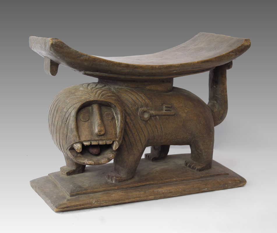 AFRICAN ASHANTI PALACE STOOL WITH GROWLING LION: From Ghana, approx. 18'' x 22 1/2'' x 12''