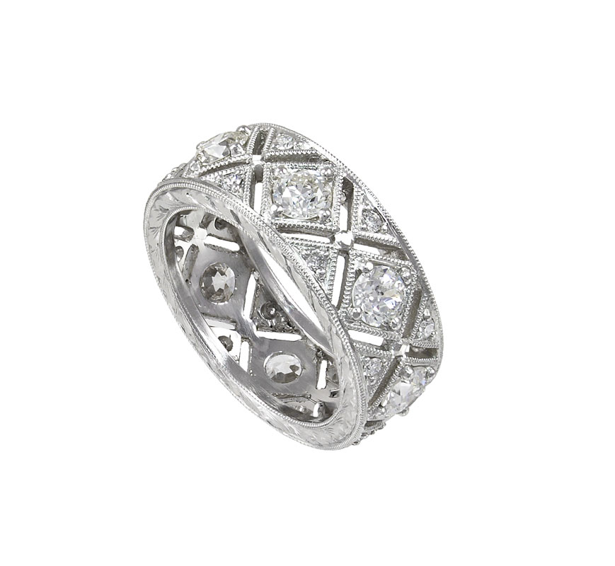 FANTASTIC HAND CRAFTED PIERCED PLATINUM DIAMOND BAND RING: Platinum ring in a pierced design of 24 old European cut diamonds totaling approx. 2.25 Ct., averaging VS in clarity and G-H color. Prong set. Weight 12.1 grams. Sold with current Florida Diamond Appraisers GIA graduates appraisal for $11,500.