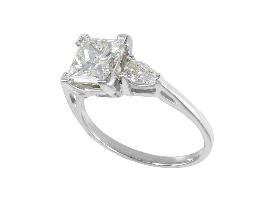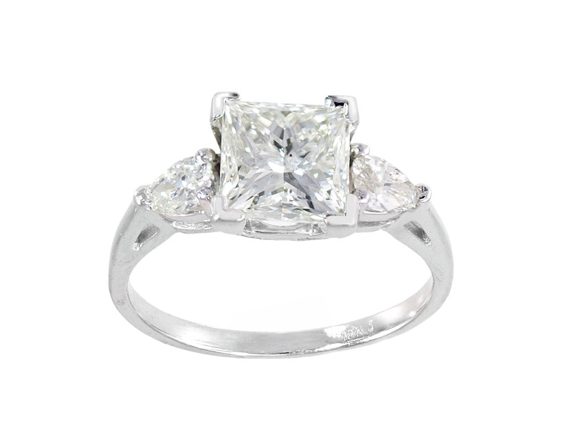 18K 2.0 CT PRINCESS CUT DIAMOND ENGAGEMENT OR RIGHT HAND RING: 18K white gold ring centers an approx, 2 Ct square modified brilliant Princess cut diamond, rated SI1 in clarity and J color. The two pear brilliant side diamonds weigh approx. .43 Ct., rated VS in clarity and I-J in color. Prong set. Weight 3.2 grams. Sold with current Florida Diamond Appraisers GIA graduates appraisal for $16,250.