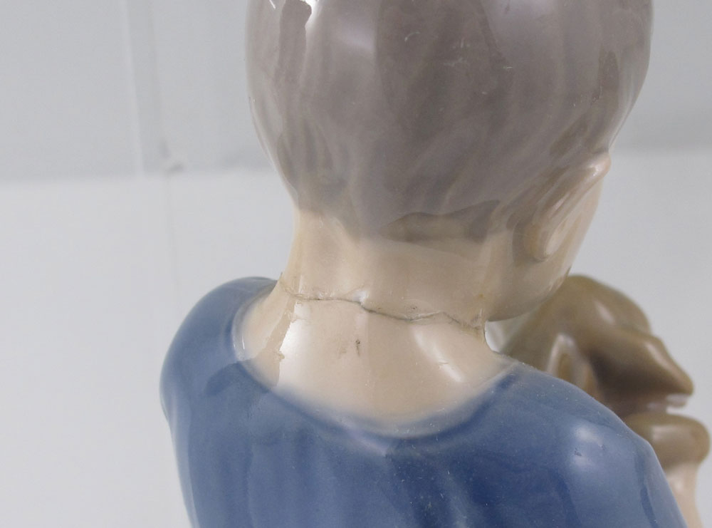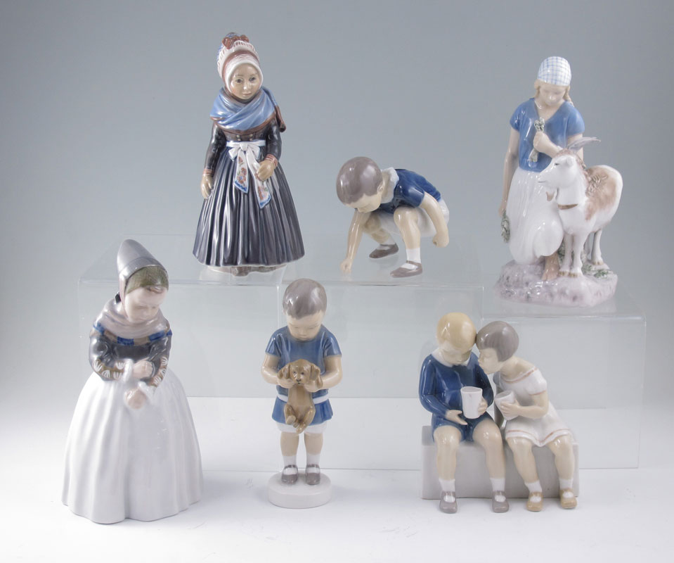 6 PIECE BING & GRONDAHL, COPENHAGEN FIGURINES: To include 1) Royal Copenhagen Maiden, #1251, 7 1/2'' h. 2) Bing & Grondahl 2 children on bench, #2175, 5 1/2'' h. 3) Bing & Grongahl boy, #1636, 3 1/2'' h. 4) Bing & Grohndal maiden with goat, #2180, 7 3/8'' h. 5) Bing & Grondahl boy with puppy, #1747, 6 1/2'', note repair to neck. 6) Dahl Jensen maiden figure, #1165, 7'' h.