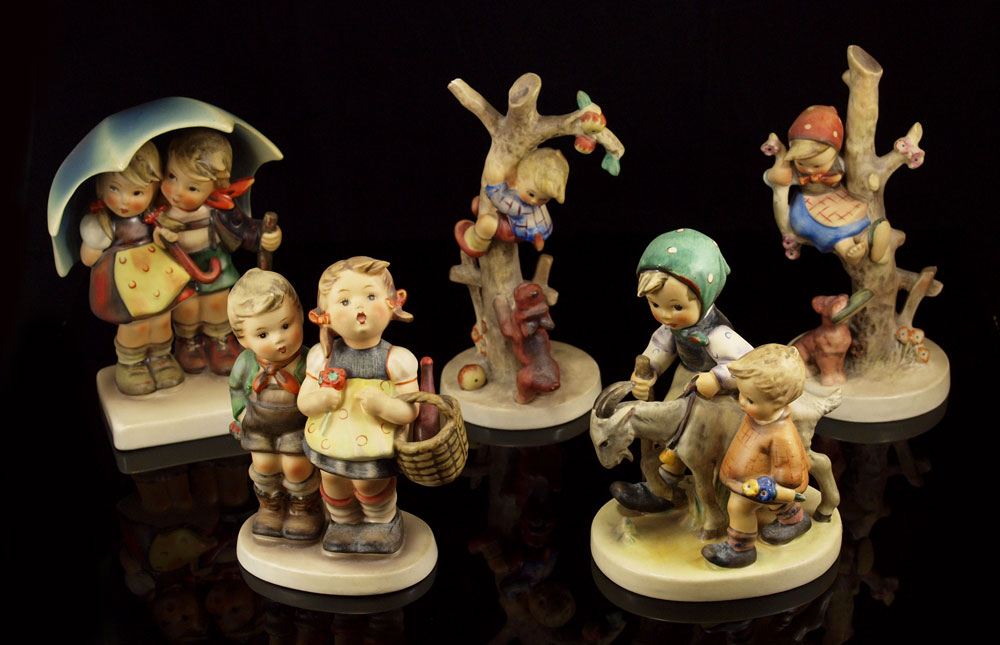 COLLECTION OF 5 HUMMEL FIGURINES: To include, STORMY WEATHER #71, TM 3, 6''h; TO MARKET #49/0, TM 3, 5 1/2''h; CULPRITS #56/A, eyes open, TM 3, crazing to under side of base, 6 3/8''h; OUT OF DANGER #49/B, eyes open, TM 3, very slight crazing to back of skirt, 6 3/8''h; HOMEWARD BOUND #334, old style, TM 4, 5 1/4''h.