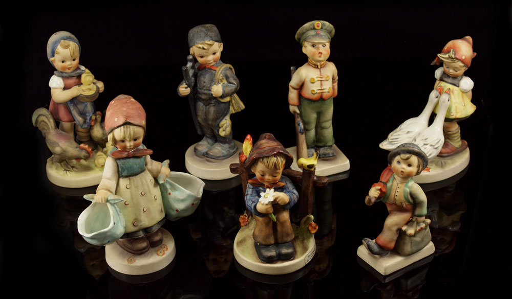 COLLECTION OF 7 HUMMEL FIGURINES: To include, SHE LOVES ME, SHE LOVES ME NOT #174, TM 5, crazing to base, 4 1/8''h; MERRY WANDERER # 11 2/0, TM 3, very tiny line of crazing upper base by right foot, 4''h; CHIMNEY SWEEP #12/I, TM 3, crazing to underside of base, 5 1/2''h; GOOSE GIRL #47/0, TM 3, 4 3/4''h; MOTHER'S DARLING #175, blue kerchief bags, TM 3, crazing, small chip to right kerchief, 5 1/2''h.