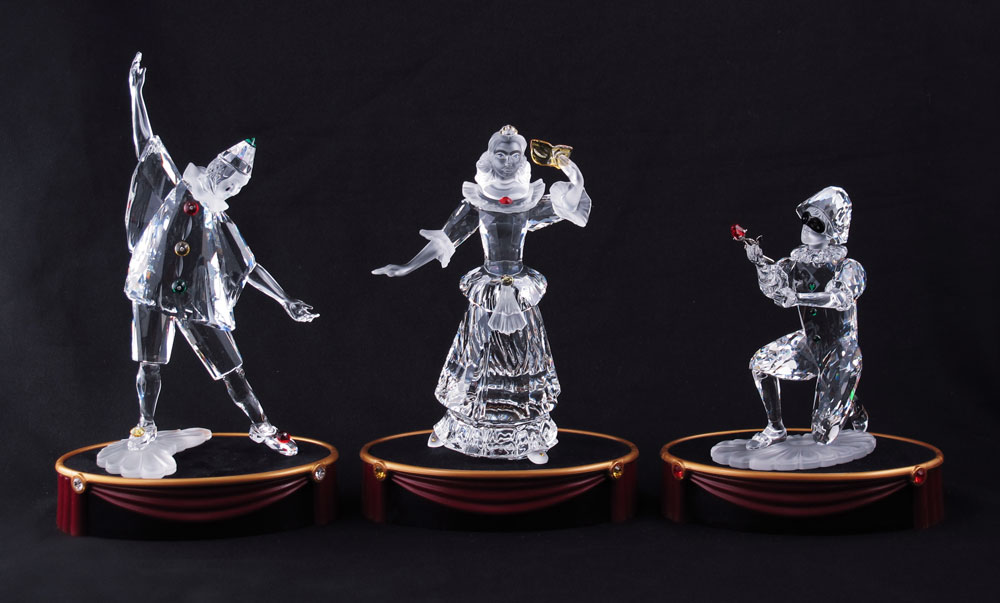 SWAROVSKI CRYSTAL ''MASQUERADE'' ANNUAL EDITION SERIES: Retired, Adi Stocker designer of all, 1999 Pierrot figure, 8''; 2000 Columbine figure, 7''; and 2001 Harlequin figure, 5 1/8''. All with ''stage'' stands, Columbine and Harlequin each with box, sleeve and book.