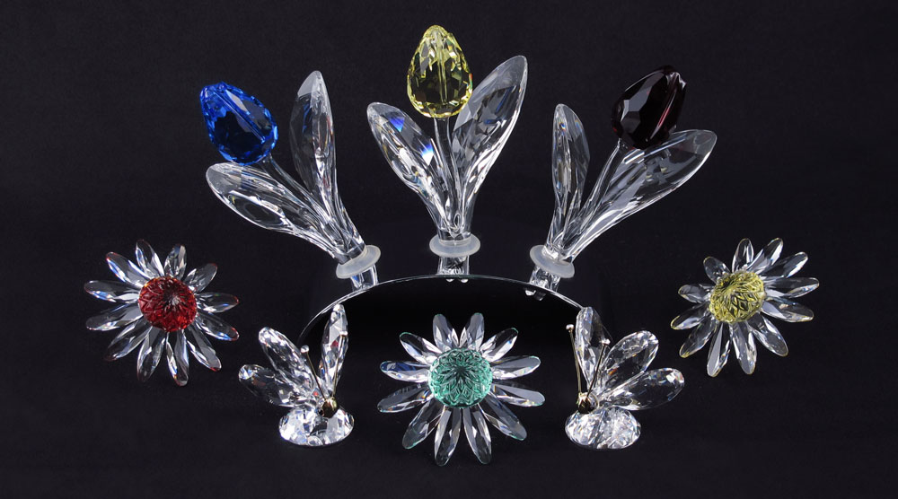 SWAROVSKI CRYSTAL FLOWERS & BUTTERFLIES: To include, RENEWAL MARGUERITE FLOWERS - 1999 YELLOW 229 778, 2000 RED 252 371 and 2001 GREEN 227 537; SCS RENEWAL TULIPS MAGIC OF DANCE - 2002 BLUE 289 287, 2003 RED 608 567, 2004 YELLOW 657 335, flowers measure 3 1/2'', TULIP STAND 600 346 with box; two MINI BUTTERFLY 7667 035 000, Var. 1 with metal nose resembling mask, approx 1 3/8'' each.