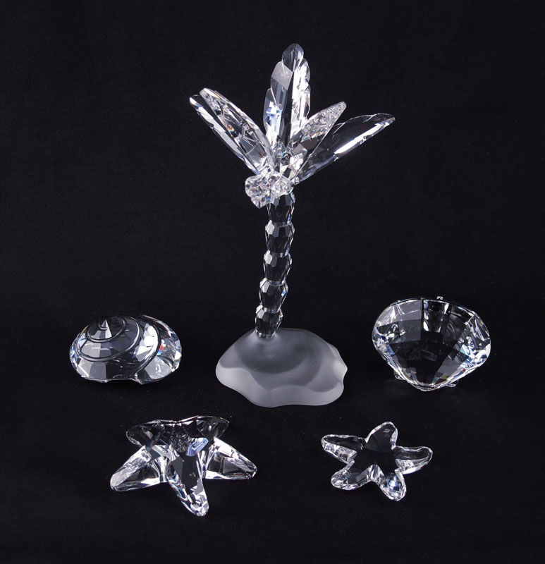SWAROVSKI CRYSTAL FIGURINES: To include, PALM TREE 7475, M. Stamey, issued 2004 retired 2007, with box, sleeve & cert; 2005 Member STARFISH 7400 200 502, Anton Hirzinger, no box or cert; 2006 Member SCALLOP 9100 000 024, Heinz Tabertshofer, no box or cert; 2007 Member TOP SHELL 9100 000 065, Heinz Tabertshofer, no box or cert; and STARFISH 7624 000 001, Michael Stamey issued 1995 retired 2003, with box no cert.