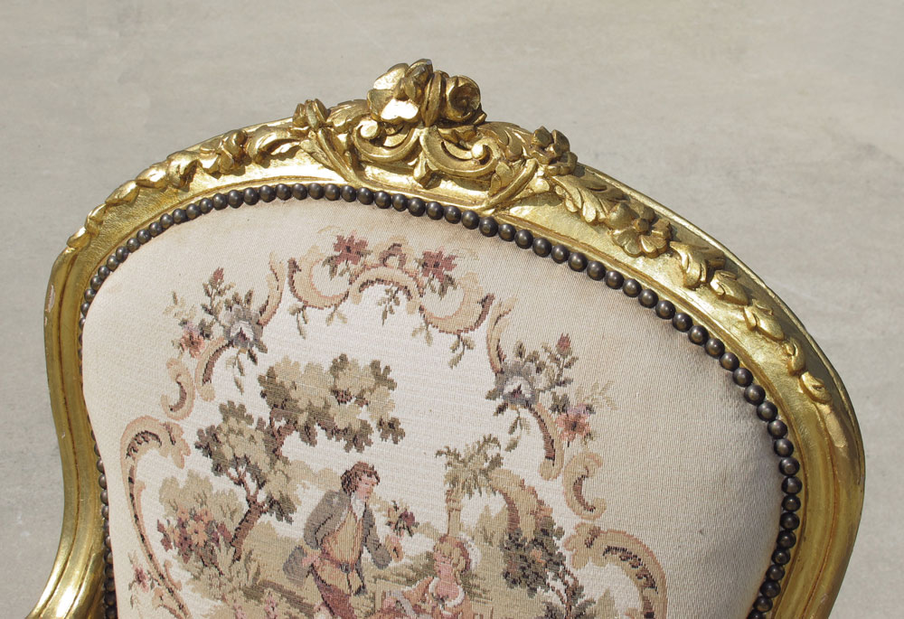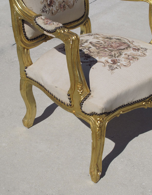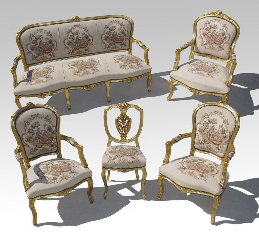 5 PC FRENCH CARVED GOLD GILT PARLOR SET: Beautiful upholstery. To include SOFA 37 3/4'' h. x 64'' x 23'', ARMCHAIR 42'' x 27 1/2'' x 23'', pair smaller ARMCHAIRS 37 3/4'' h. x 25'' x 25 1/2'', PARLOR CHAIR 35 1/2'' h. x 16 1/2'' x 16 1/2''. Mid to late 20th C.